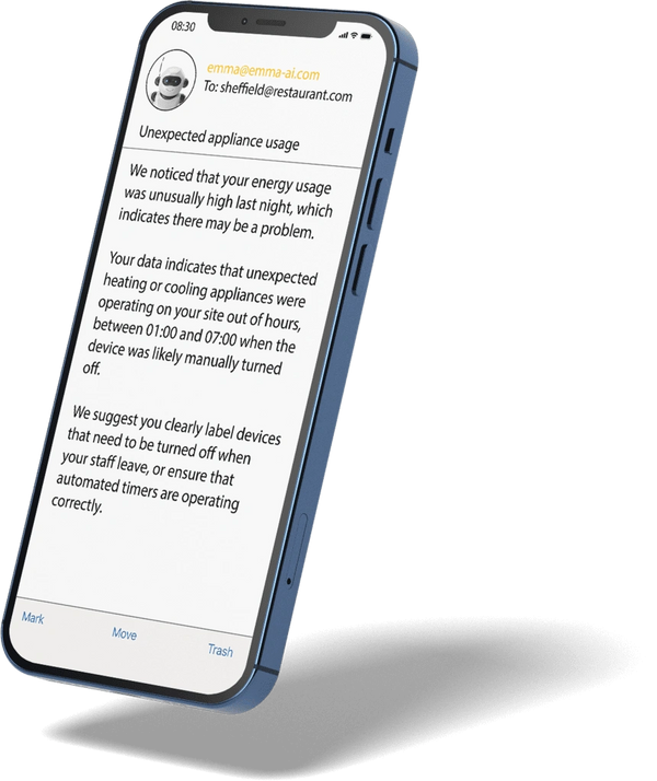 EMMA AI analyses data that you already have in your business to pinpoint exactly where energy is being wasted across all your sites, advising you directly how to fix it quickly – saving your business energy & thousands of pounds every year!